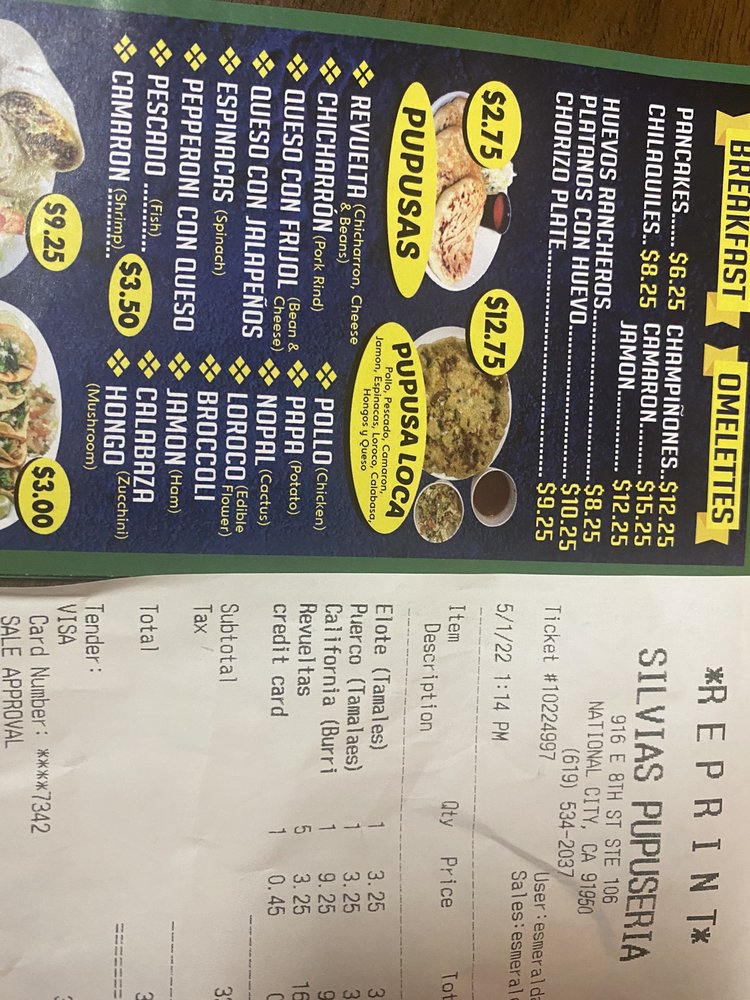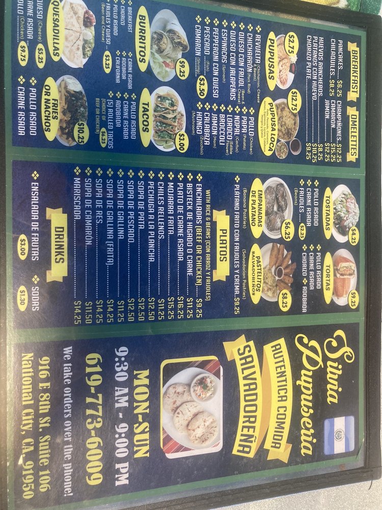 Silvia Pupuseria offers a unique blend of Mexican and Salvadoran cuisine in National City, CA. Their extensive menu includes a variety of breakfast options like Casamiento Grilled chorizo and Pancakes, as well as traditional dishes like Chicharron Pupusas and Elote Tamales. The restaurant provides a casual dining experience with options for vegan and vegetarian customers. With amenities like outdoor seating, Wi-Fi, and happy hour specials, Silvia Pupuseria caters to a diverse range of diners. The dishes are flavorful and authentic, showcasing the richness of Salvadoran flavors. I highly recommend trying the Loroco Pupusa and Platano con Frijoles y Crema for a true taste of El Salvador. Silvia Pupuseria is a must-visit for anyone looking to explore the vibrant and delicious world of Salvadoran cuisine.